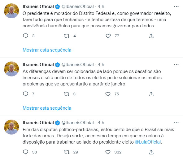 Fim das disputas político-partidárias, estou certo que o Brasil sai mais forte das urnas. Desejo sorte, ao mesmo tempo em que me coloco à disposição para trabalhar ao lado do presidente eleito Luis Inácio Lula da Silva. As diferenças devem ser colocadas de lado porque os desafios são imensos e só a união de todos os eleitos pode solucionar os muitos problemas que se apresentarão a partir de janeiro. O presidente é morador do Distrito Federal e, como governador reeleito, farei tudo para que tenhamos – e tenho certeza que teremos – uma convivência harmônica para que possamos governar para todos.
